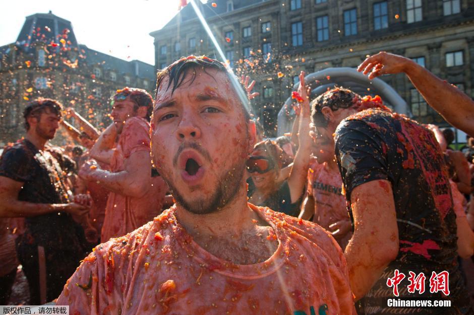 当地时间2014年9月14日,荷兰阿姆斯特丹,民众参加番茄大战,选手互扔西红柿High翻天,现场变成一片红色的海洋。