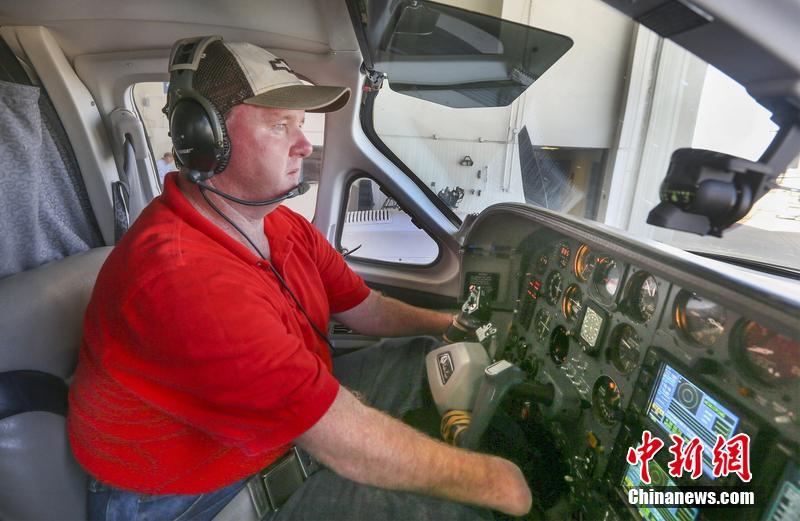 当地时间2014年9月12日报道,美国威奇托,Randy Green坐在Cessna 421内,他在贾巴拉机场接受飞行训练。虽然生下来就没有手和脚,但Randy还是接受训练成为一名公司飞行员。图片来源:东方IC 版权作品 请勿转载