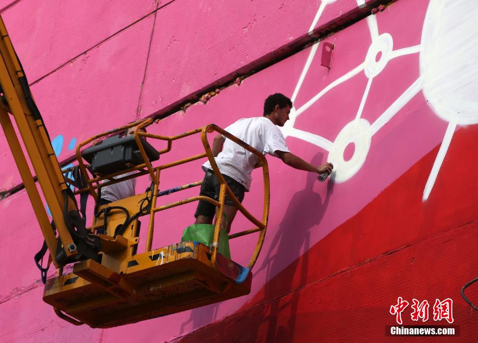 近日,俄罗斯莫斯科,市民们在前Moskvitch车厂外创作全俄罗斯最大的涂鸦壁画。图片来源:东方IC 版权作品 请勿转载