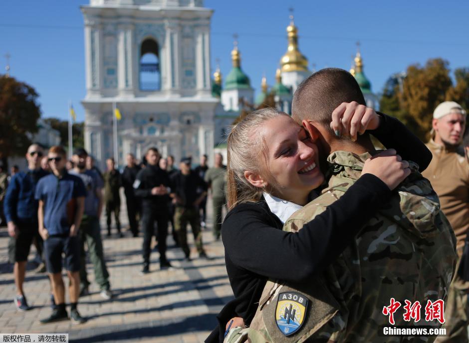 当地时间9月15日,乌克兰基辅,从前线轮换回来的“亚述”营志愿者,返回家乡,与等待他们的女友亲密相拥。