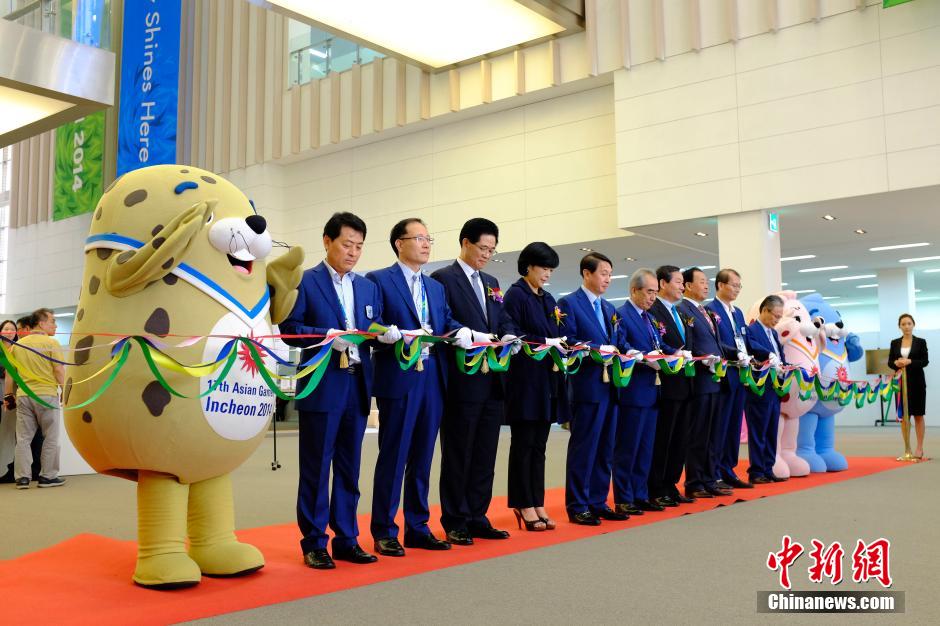 9月16日,韩国仁川亚运会主媒体中心正式投入使用。图为亚运会组委会官员为主媒体中心剪彩。中新社发 侯宇 摄