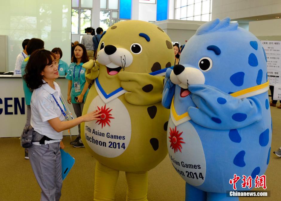 9月16日,韩国仁川亚运会主媒体中心正式投入使用,图为吉祥物风(右)和光(中)在媒体中心摆出造型。本届亚运会吉祥物为三只海豹,分别命名为:风、舞、光。中新社发 侯宇 摄