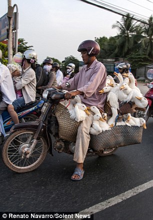 据英国《每日邮报》近日报道,越南一名男子骑摩托车载着约40只鹅出行,这群鹅则老老实实呆在里面,没有任何逃跑迹象。这一幕拉风的景象被摄影师 Renato Navarro拍到。(网页截图)