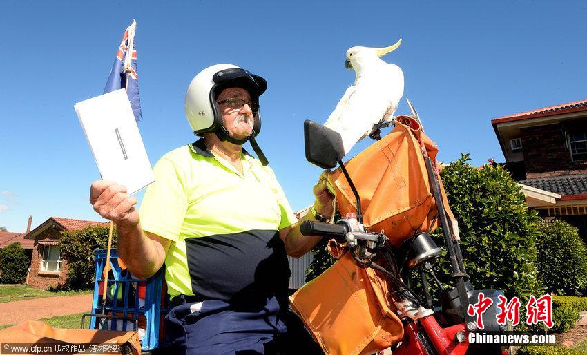 当地时间2014年9月9日,澳大利亚阿伯丁,“乔治”是一只凤头鹦鹉,它自从6个月大就每天和邮递员Bob Johnston 行驶80千米前往澳大利亚新南威尔士州猎人谷地区派发邮件,只在下雨天偶尔休息。它俨然已经是一名优秀的小邮递员。图片来源:CFP视觉中国