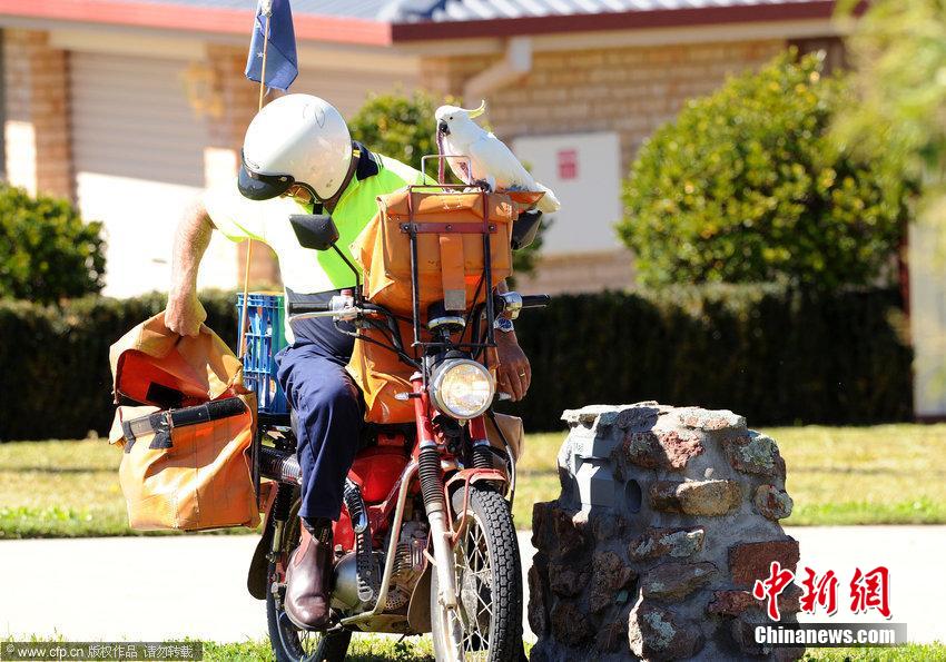 当地时间2014年9月9日,澳大利亚阿伯丁,“乔治”是一只凤头鹦鹉,它自从6个月大就每天和邮递员Bob Johnston 行驶80千米前往澳大利亚新南威尔士州猎人谷地区派发邮件,只在下雨天偶尔休息。它俨然已经是一名优秀的小邮递员。图片来源:CFP视觉中国
