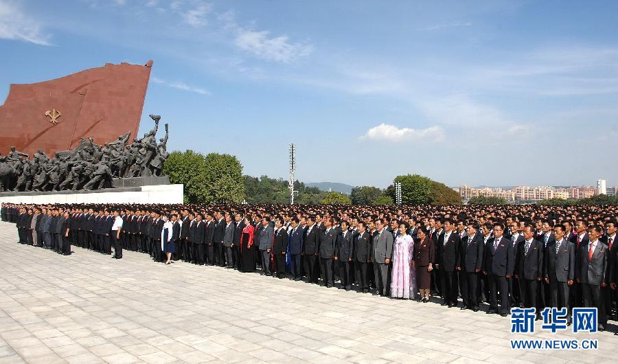 这张朝中社9月15日提供的照片显示,朝鲜金日成社会主义青年同盟第四次基层干部大会与会者15日来到平壤万寿台瞻仰金日成主席和金正日总书记铜像。与会者向铜像敬献花篮和花束,鞠躬致敬。图片来源:新华网