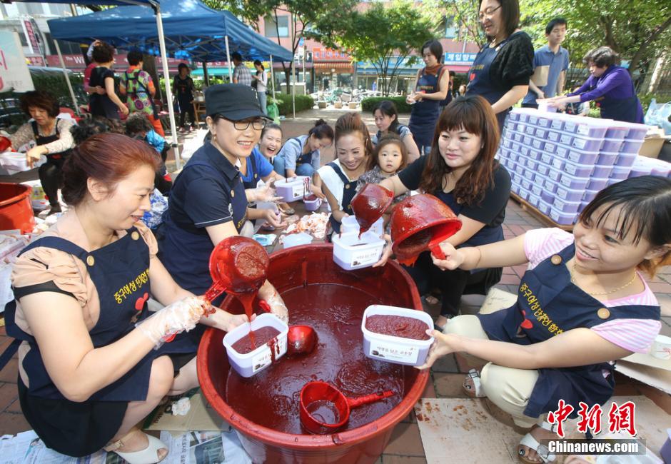 当地时间2014年9月16日,韩国首尔,多文化家庭的妇女们聚集在一起制作韩国辣椒酱,送给低收入家庭。