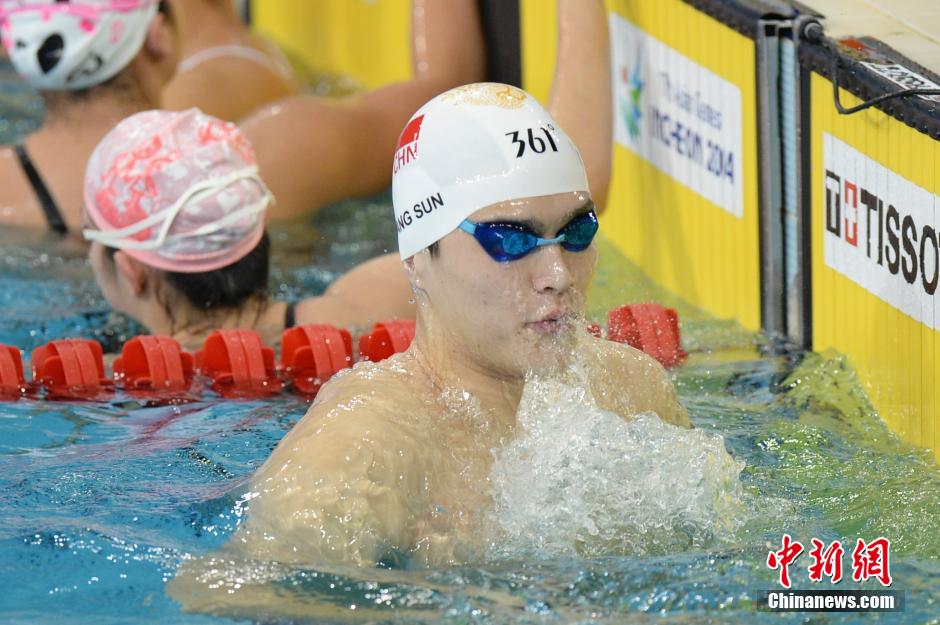 9月17日,中国国家游泳队来到仁川朴泰桓游泳馆训练,中国游泳名将孙杨参加训练。中新社发 廖攀 摄
