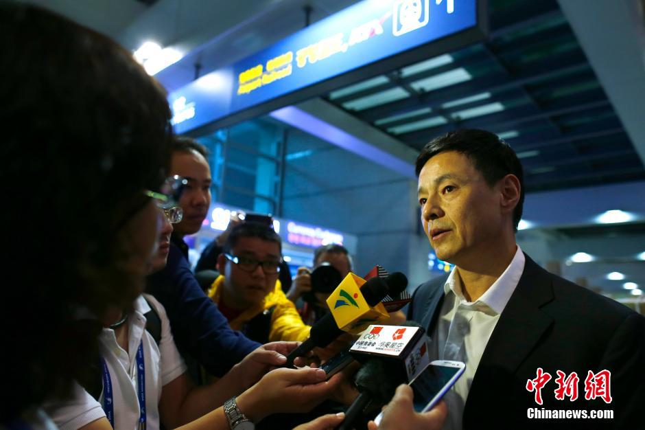 9月17日,中国亚运代表团抵达仁川国际机场。图为中国亚运代表团秘书长蔡家东(右)接受媒体采访。中新社发 富田 摄