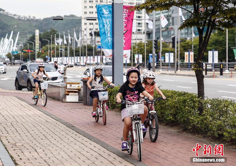 9月17日,韩国仁川亚运会主新闻中心旁,几名小朋友在街头骑单车,旁边是亚运会的宣传横幅。19日,第17届亚运会即将在仁川开幕。中新社发 张浩 摄