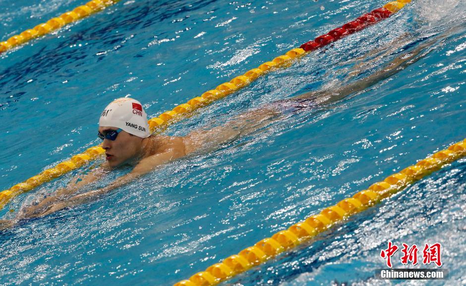 9月17日,中国游泳名将孙杨亮相“朴泰桓游泳馆”,在教练的带领下进行赛前训练,备战即将举行的仁川亚运会。中新社发 汤彦俊 摄