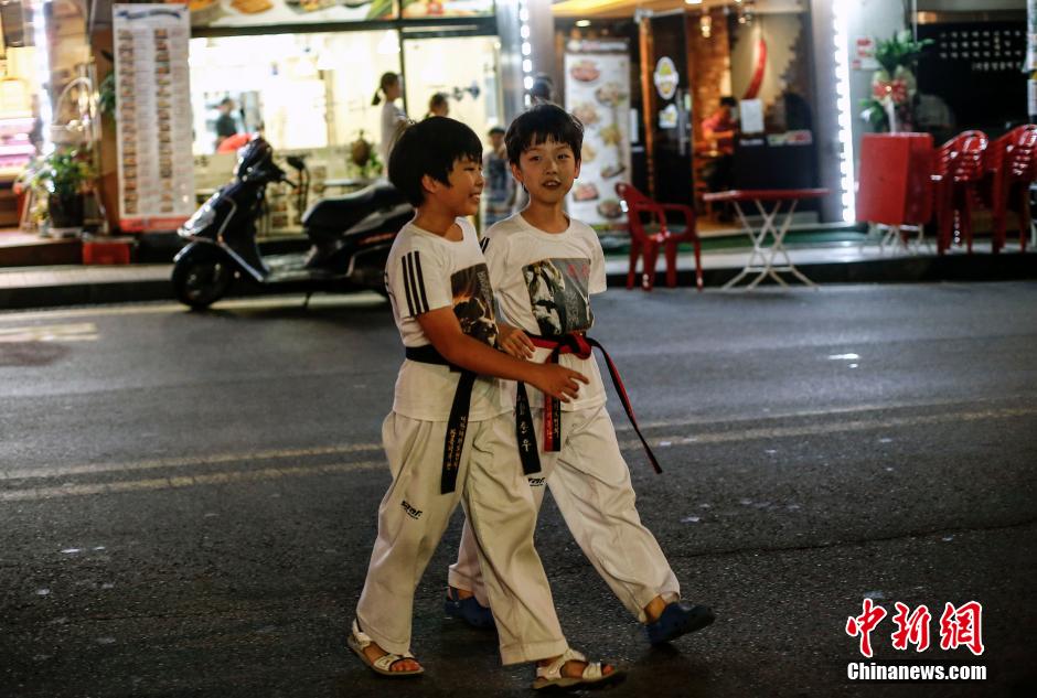 9月17日,韩国仁川亚运会媒体村旁,两位刚刚练习完跆拳道的小朋友走在街头。19日,第17届亚运会即将在仁川开幕。中新社发 张浩 摄