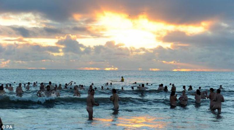 据《每日邮报》2014年9月21日报道,英国诺森伯兰郡,超过350人参加第三届东北裸泳活动,欲打破最多人同时裸泳的世界纪录。该活动由国民托管组织主办,活动参与者早晨5点半抵达沙滩,于日出之时下海。(网页截图)