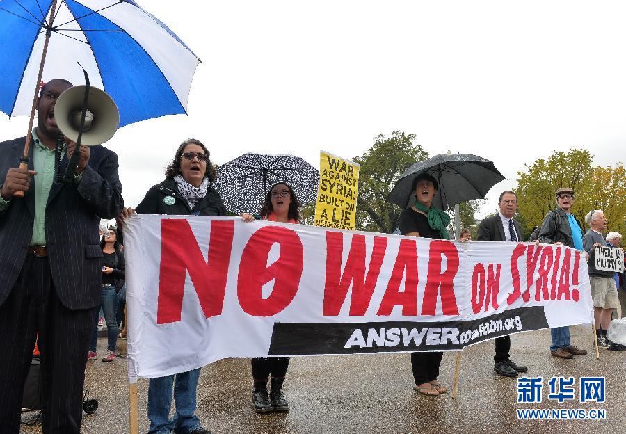 9月25日,在美国首都华盛顿白宫前,反战人士抗议美国总统奥巴马授权对叙利亚、伊拉克境内目标进行空袭的行为。 新华社记者鲍丹丹摄