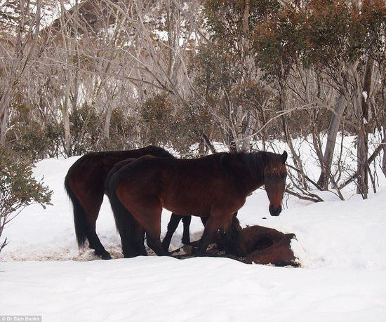 拍下照片的两名生态学家分别是德里斯科尔(Driscoll)博士和山姆?班克斯( Sam Banks)博士。其实在拍下这张照片之前的一天,两人在上山的途中就已发现了一具野马尸体。这具马尸的腹部被撕咬开,内脏已经被啃食一空。但当时德里斯科尔和班克斯仍未能想到,对这匹马“痛下杀手”的到底是怎么样的猎食者。然而就在第二天,两人就解开了谜题——下山路上,德里斯科尔和班克斯看见了三匹野马,它们显然正在分食前方一具马尸的内脏。
