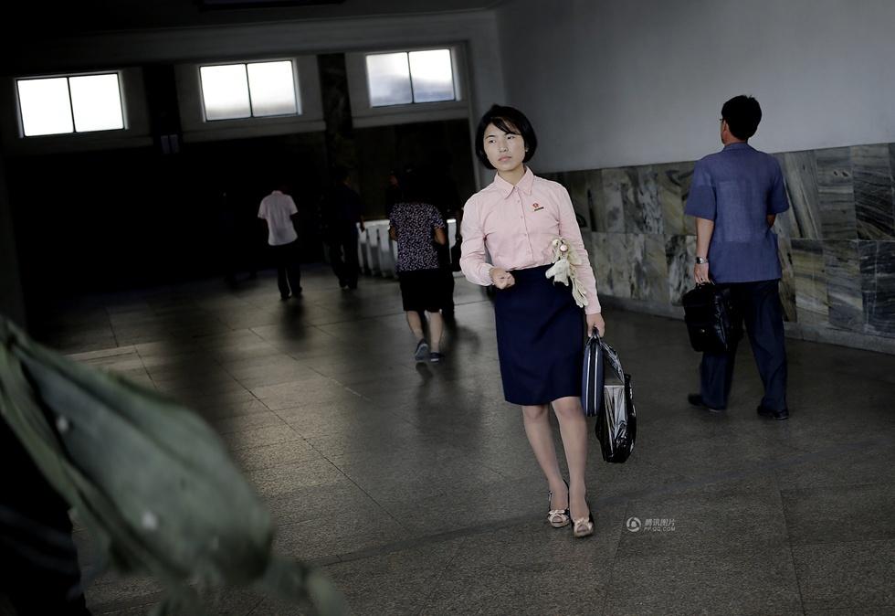 当地时间2014年9月1日,朝鲜平壤,一名朝鲜女子离开地铁站。在朝鲜生活水平相对较高的平壤,服饰和民众的穿衣风格在近些年不断地发生着变化,虽然缓慢且受到一定的限制,但程度远超许多外人的想象。