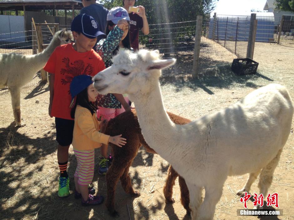 当地时间9月27日是美国国家羊驼农场节,旧金山湾区华人与呆萌羊驼近距离接触。羊驼主要产自南美安第斯山脉的秘鲁、智利和玻利维亚等地。羊驼的皮毛制品比羊毛更高档。中新社发 刘丹 摄