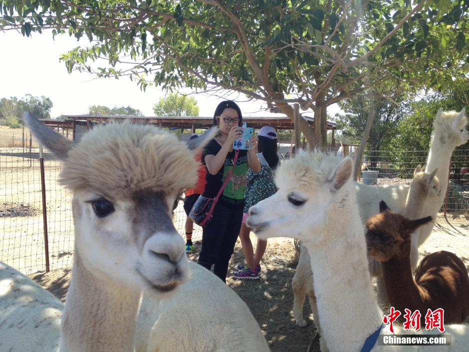 当地时间9月27日是美国国家羊驼农场节,旧金山湾区华人与呆萌羊驼近距离接触。羊驼主要产自南美安第斯山脉的秘鲁、智利和玻利维亚等地。羊驼的皮毛制品比羊毛更高档。中新社发 刘丹 摄