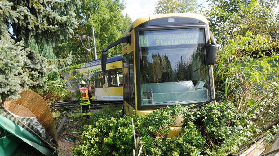 国际在线专稿:据德国《图片报》9月27日报道,当地时间9月27日上午,德国法兰克福市(Frankfurt amMain)的一列轻轨列车因转弯时速度过快而脱轨,最终冲进了路边的一个小型公园内。