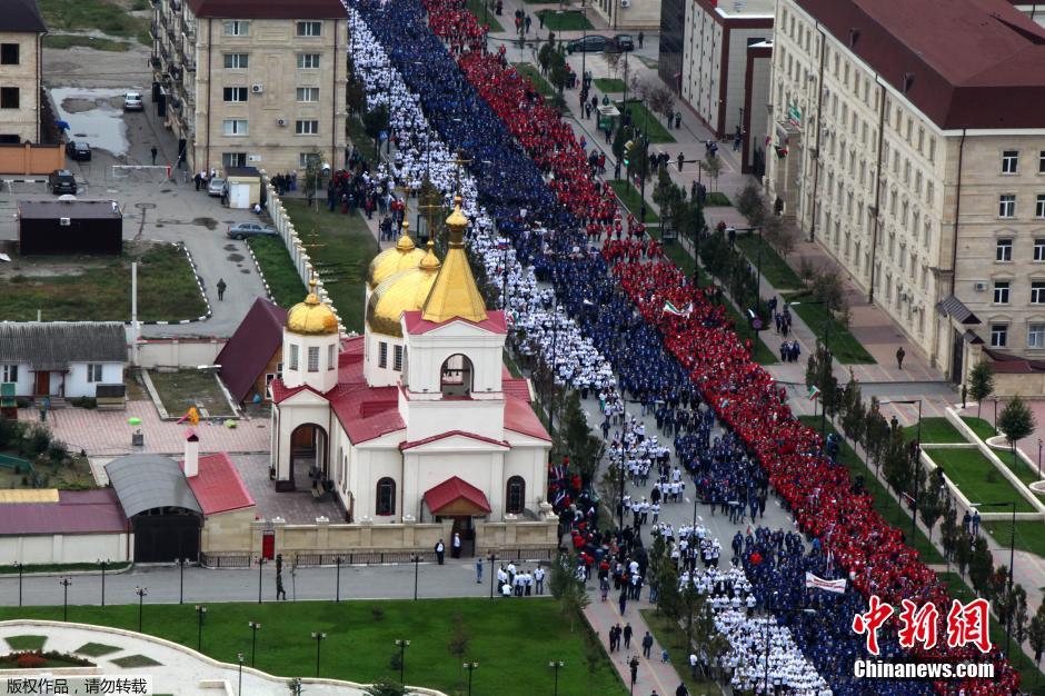 车臣民众组成人体国旗游行 庆祝普京62岁生日