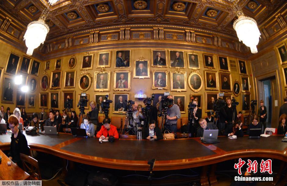 据诺贝尔奖官方网站消息,诺贝尔物理学奖于当地时间7日揭晓,赤崎勇(Isamu Akasaki)、天野浩(Hiroshi Amano)和中村修二(Shuji Nakamur)获奖。图为门外等候的记者。