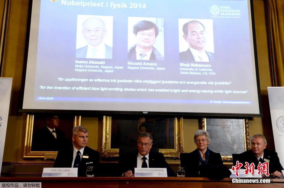 据诺贝尔奖官方网站消息,诺贝尔物理学奖于当地时间7日揭晓,赤崎勇(Isamu Akasaki)、天野浩(Hiroshi Amano)和中村修二(Shuji Nakamur)获奖。图为三名获奖者照片。