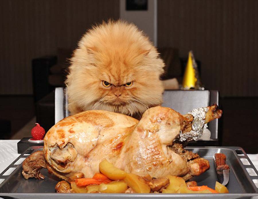 加菲怒视烤鸡,看起来像是心怀诡计。(网页截图)