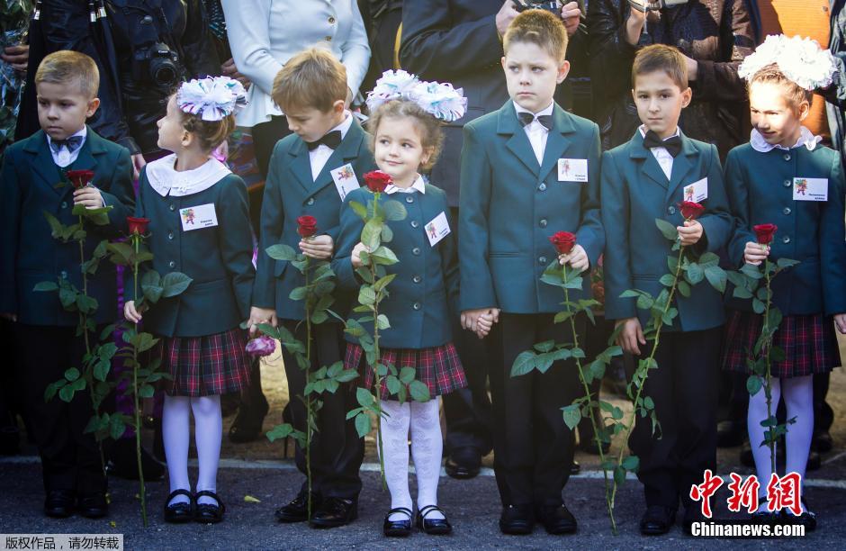 当地时间2014年10月1日,乌克兰顿涅茨克,由于战火而推迟一个月开学的顿涅茨克学校终于迎来了开学首日,学生们到学校开始上课。
