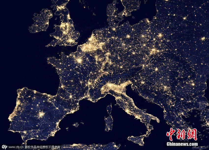 2014年10月2日消息,美国宇航局公布了美国Suomi国家极地轨道伴随卫星(Suomi NPP)上装载的可见光红外成像辐射计组合仪(VIIRS)2012年拍摄的欧洲夜景照片。图片来源:CFP视觉中国