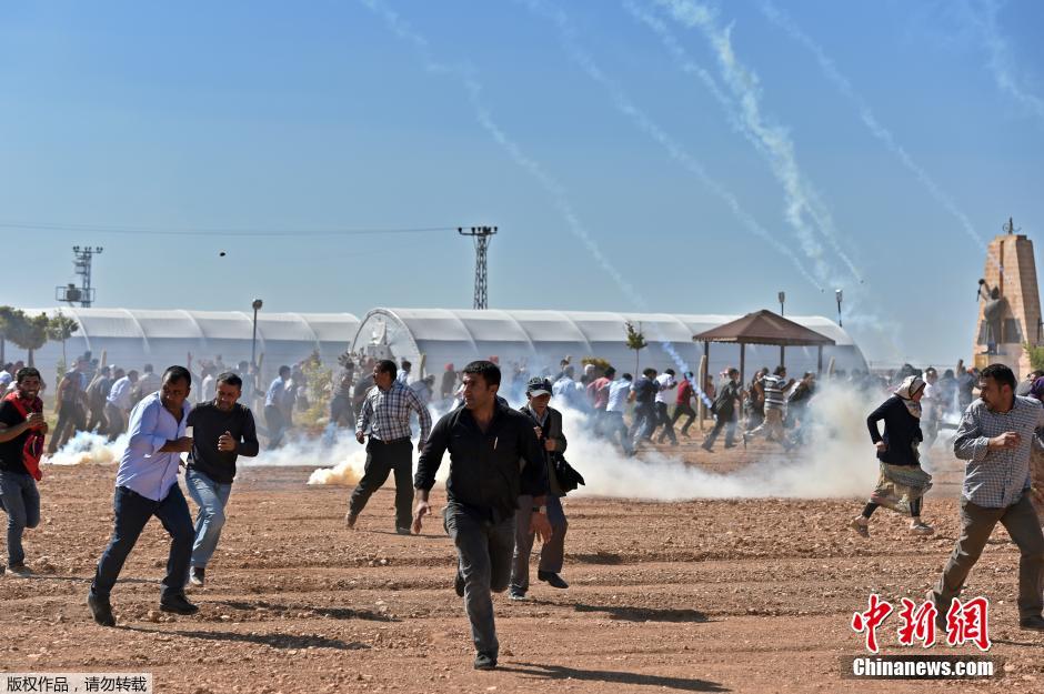 当地时间2014年10月4日,土耳其桑尼乌法,库尔德示威者与土耳其士兵发生冲突。