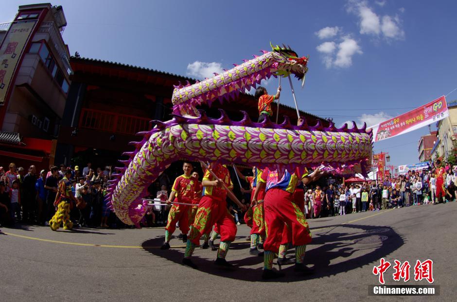 当地时间10月4日,韩国仁川中华街正在进行中国传统舞龙表演。仁川于10月3日起在中华街举办为期三天的“中国文化旅游庆典”,以促进中韩两国的文化交流。庆典期间,既有中国传统的舞狮、舞龙、武术等表演,也有空竹、麻将等中国民间玩物的体验展示,吸引了大量中韩两国民众观光。仁川中华街是韩国最大的“唐人街”,1883年仁川港开埠,1884年这条唐人街所在地区被指定为清政府的治外法权地,以后逐渐形成华人聚居地。 中新社发 贾天勇 摄
