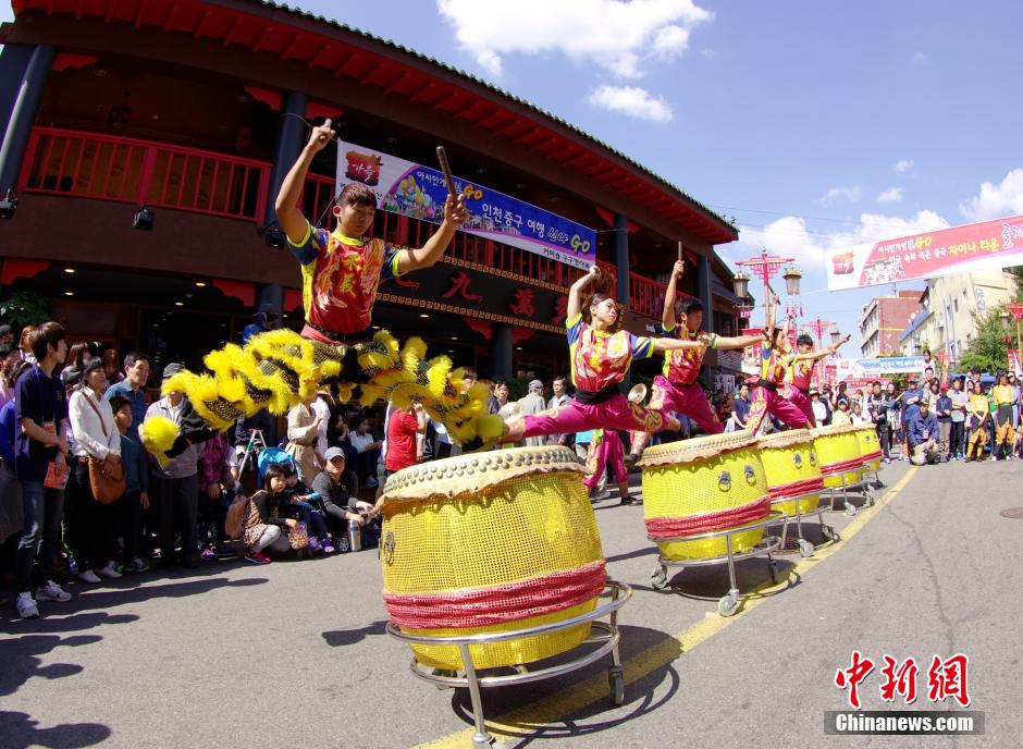 当地时间10月4日,韩国仁川中华街正在进行中国传统舞龙表演。仁川于10月3日起在中华街举办为期三天的“中国文化旅游庆典”,以促进中韩两国的文化交流。庆典期间,既有中国传统的舞狮、舞龙、武术等表演,也有空竹、麻将等中国民间玩物的体验展示,吸引了大量中韩两国民众观光。仁川中华街是韩国最大的“唐人街”,1883年仁川港开埠,1884年这条唐人街所在地区被指定为清政府的治外法权地,以后逐渐形成华人聚居地。 中新社发 贾天勇 摄