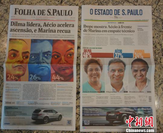 当地时间10月5日上午8时,2014年巴西大选第一轮投票正式开始。巴西1.42亿选民将选出新一任总统和副总统、各州州长及联邦区长、27位联邦参议员、513位联邦众议员和1059位州议员。图为5日新出版的当地《圣保罗页报》与《圣保罗州报》头版,大幅刊登罗塞夫、内维斯和席尔瓦三位总统候选人照片。中新社记者 莫成雄摄
