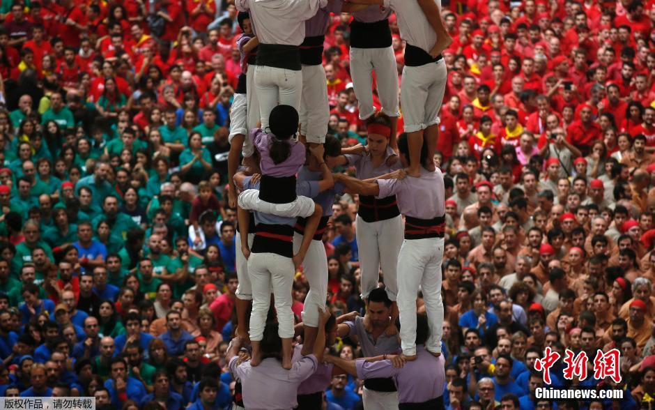 当地时间2014年10月5日,西班牙加泰罗尼亚地区塔拉戈纳,第25届“叠人塔”大赛举行,能搭出最有难度“人塔”的队伍将获得冠军。据悉,“叠人塔”起源于18世纪末,是西班牙加泰罗尼亚地区最具特色的传统民俗活动,通常人塔都在7层左右,最高的可以达到10层,“叠人塔”多见于当地庆典,由身着白裤、黑布缠腰的“塔人”一层层以叠罗汉的方式搭成高“塔”。