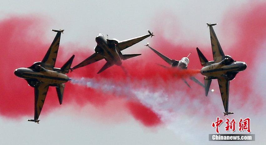 当地时间2014年10月6日,“2014京畿国际航空展”媒体日活动在水原空军基地进行,韩国空军飞行表演队“黑鹰”进行精彩的飞行表演。图片来源:CFP视觉中国