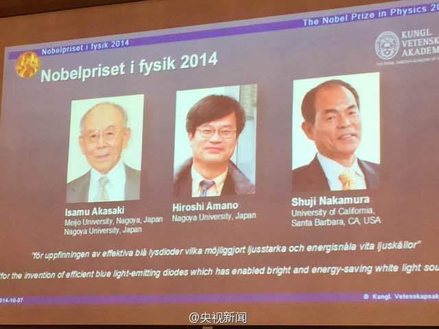 据诺贝尔奖官方网站消息,诺贝尔物理学奖于当地时间7日揭晓,赤崎勇(Isamu Akasaki)、天野浩(Hiroshi Amano)和中村修二(Shuji Nakamur)获奖。图为三名获奖者照片。图片来源:央视新闻微博