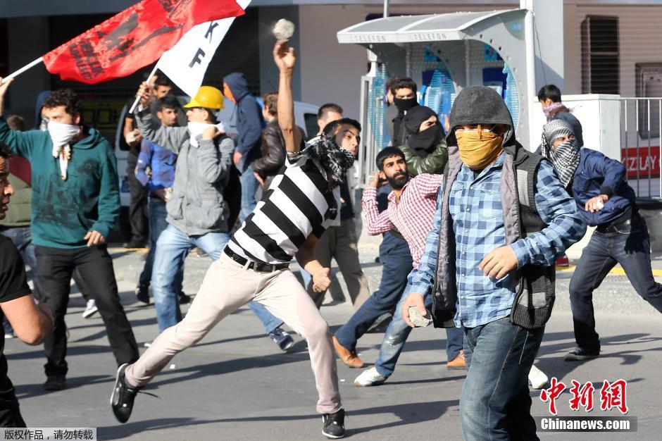 当地时间2014年10月7日,土耳其多地示威者举行示威游行,抗议“伊斯兰国”激进分子攻打叙土边境城镇艾因阿拉伯,同时抗议土耳其政府不作为。示威者与警方发生冲突。