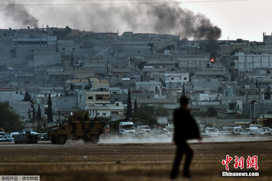 当地时间2014年10月7日,叙利亚科巴尼镇遭空袭后升起黑烟。叙利亚库尔德武装与伊斯兰极端组织之间的战事加剧。科巴尼是叙利亚库尔德人聚居地之一,具有一定战略意义,自9月中旬以来,叙利亚境内极端组织开始围攻科巴尼。