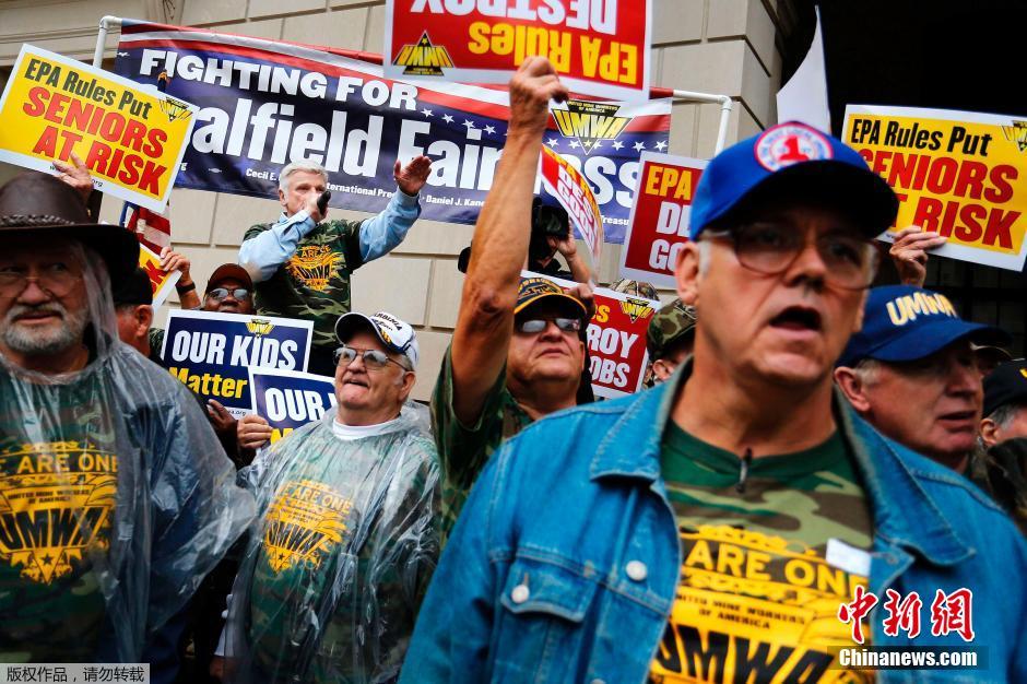 当地时间2014年10月7日,美国华盛顿,联合矿工工会的成员举行示威游行,抗议环保局清洁能源规划,声称该计划将会破坏国家的煤炭行业,以及相关就业。
