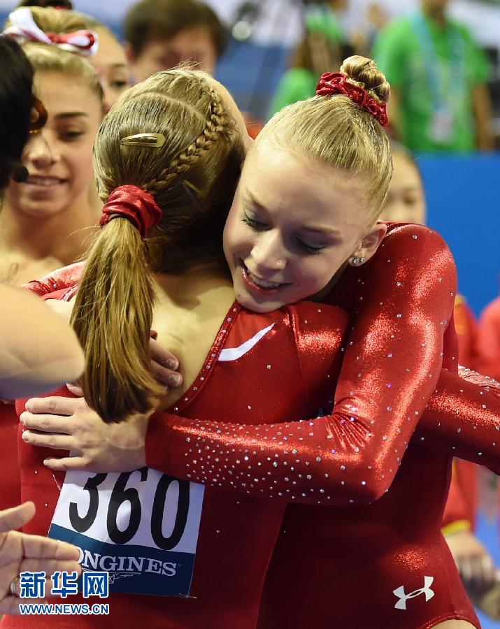 10月8日,美国队选手在比赛后庆祝夺冠。当日,在第45届世界体操锦标赛女子团体决赛中,美国队夺得女子团体冠军。 新华社记者杨宗友摄