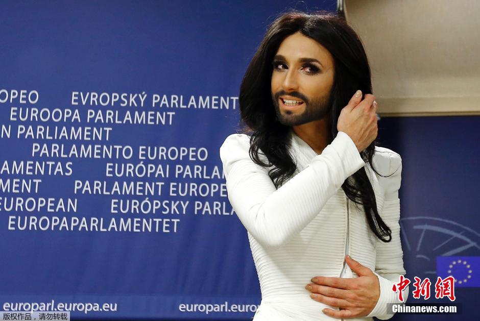 当地时间10月8日,比利时布鲁塞尔奥地利变性歌手肯奇塔·沃斯特在欧洲议会出席新闻发布会。肯奇塔·沃斯特将在欧洲议会举办演唱会,以支持同性恋和性别歧视报告的采纳。