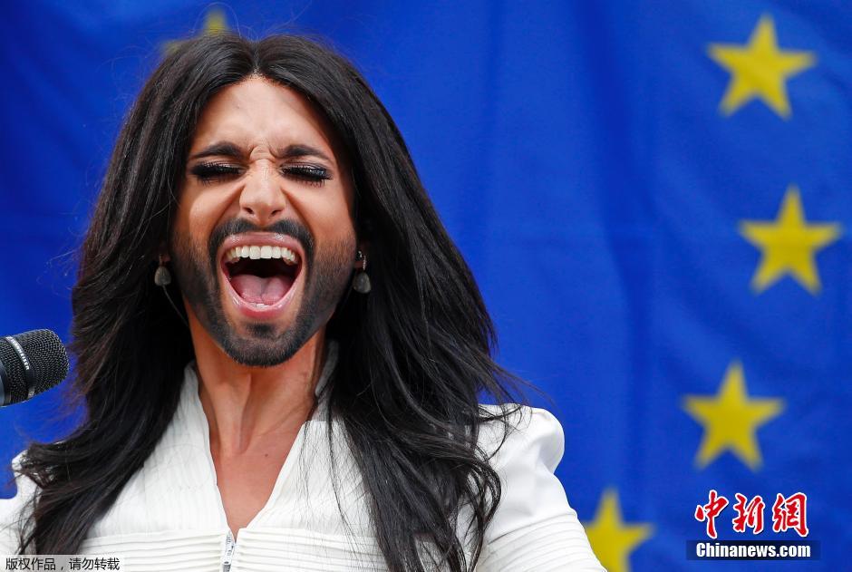 当地时间10月8日,比利时布鲁塞尔奥地利变性歌手肯奇塔·沃斯特在欧洲议会出席新闻发布会。肯奇塔·沃斯特将在欧洲议会举办演唱会,以支持同性恋和性别歧视报告的采纳。