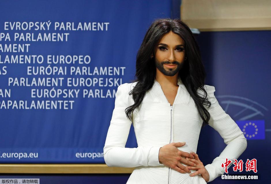 当地时间10月8日,比利时布鲁塞尔奥地利变性歌手肯奇塔·沃斯特在欧洲议会出席新闻发布会。肯奇塔·沃斯特将在欧洲议会举办演唱会,以支持同性恋和性别歧视报告的采纳。