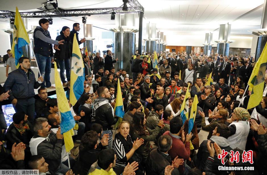 当地时间2014年10月7日,比利时布鲁塞尔,大约50名库尔德示威者冲击欧洲议会,部分示威者获得议会议长舒尔茨的接见,后者承诺就库尔德人的困境与北约和欧盟领导人进行磋商。