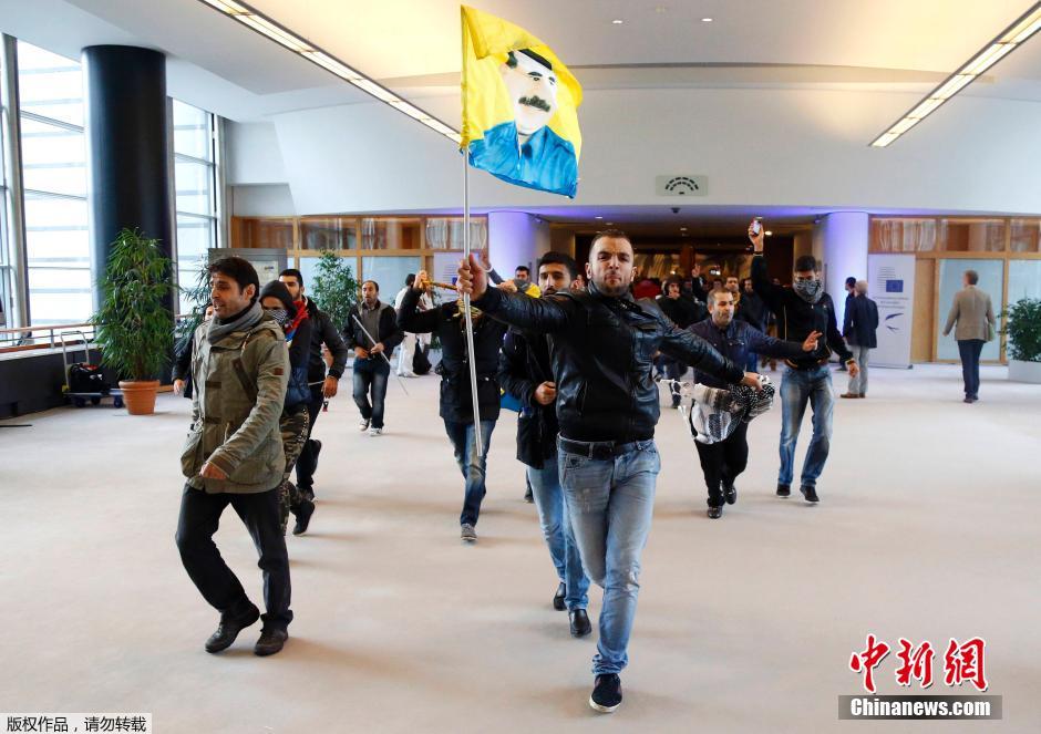 当地时间2014年10月7日,比利时布鲁塞尔,大约50名库尔德示威者冲击欧洲议会,部分示威者获得议会议长舒尔茨的接见,后者承诺就库尔德人的困境与北约和欧盟领导人进行磋商。