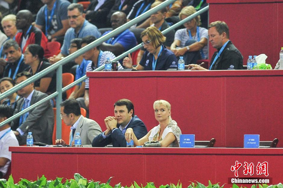 10月9日晚,俄罗斯“冰美人”霍尔金娜(前排右一)现身在广西南宁举办的第45届世界体操锦标赛比赛现场,观看男子个人全能决赛。中新社发 洪坚鹏 摄