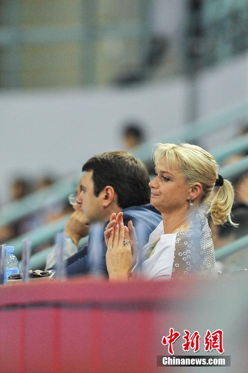 10月9日晚,俄罗斯“冰美人”霍尔金娜现身在广西南宁举办的第45届世界体操锦标赛比赛现场,观看男子个人全能决赛。中新社发 洪坚鹏 摄