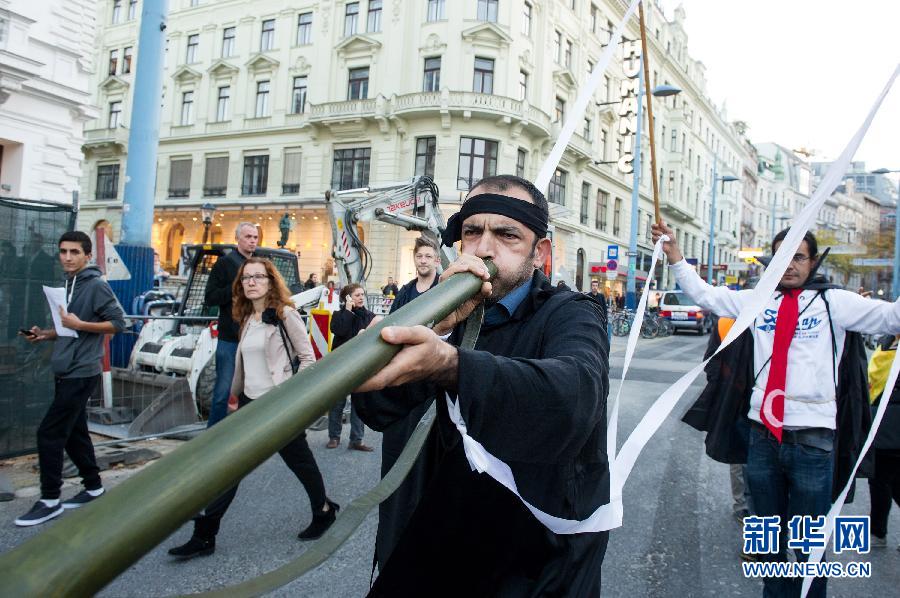 10月10日,市民在奥地利首都维也纳参加反对“伊斯兰国”游行。当日,5000多位民众在维也纳举行游行,强烈谴责极端组织“伊斯兰国”武装攻击叙利亚边境城市科巴尼的犯罪行径。 新华社记者钱一摄