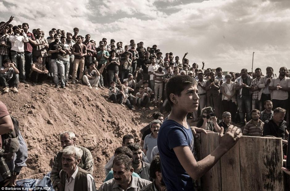 据《每日邮报》报道,当地时间2014年10月9日,3名库尔德战士在抵抗叙利亚极端武装的战斗中牺牲,悲痛的民众为3名勇士举行葬礼。图为一个孩子目送战士的遗体下葬。(网页截图)
