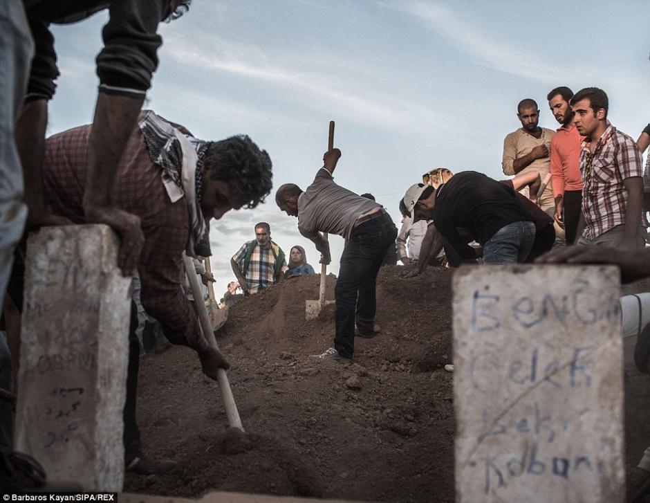 据《每日邮报》报道,当地时间2014年10月9日,3名库尔德战士在抵抗叙利亚极端武装的战斗中牺牲,悲痛的民众为3名勇士举行葬礼。图为村民正在埋葬三位库尔德战士。(网页截图)